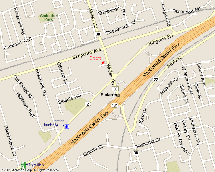 Exit Hwy 401 at Whites Road (exit 394) coming from either direction, go NORTH, through the lights at Kingston Road (Highway 2), short left on Dunfair St. Meeting room is near this (South) side of the school.